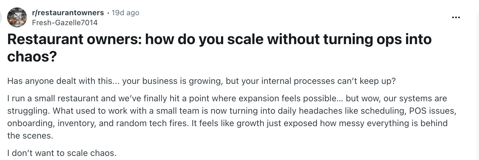 It’s a hot topic: scaling your business. When to scale, how to scale and what to do before you scale may be just a few of the things swirling around in your head (and rightfully so!). And while operating a restaurant can sometimes get a little chaotic, scaling your business doesn’t have to be. But what happens when your internal processes aren’t expanding at quite the same rate? Let’s take a look at what one restaurant operator on Reddit had to say:
