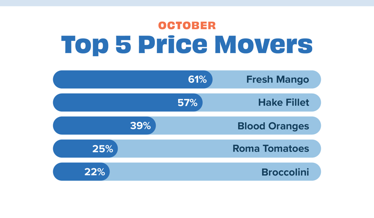 Whole turkey topped our Droppers list with prices -35% lower on average than in September. Honorable mention also goes to eggs, whose prices dropped -25% over the same period. Fresh mango topped the Movers list with a sour +61% average price increase, followed by Hake fillets, blood oranges and Roma tomatoes.